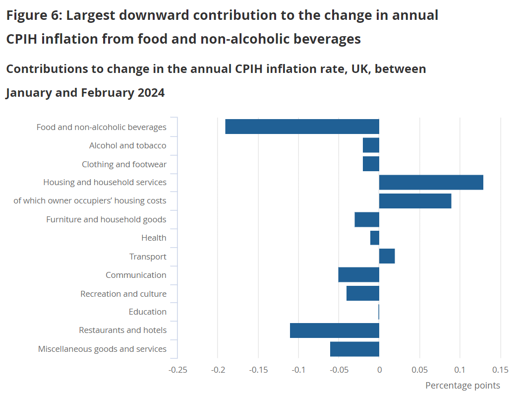 Największy wpływ na wzrost miały budownictwo mieszkaniowe, usługi dla gospodarstw domowych i paliwa silnikowe. Największy wpływ na spadek rocznego wskaźnika CPI miały żywność, restauracje i kawiarnie. Dzisiejszy odczyt jest najniższym od września 2021 roku. Źródło: ONS