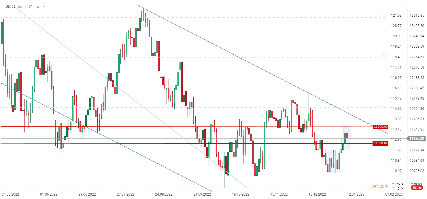 US100 wyraźnie traci po odczycie! Jest to efekt rozczarowania tym, że inflacja wypada zgodnie z oczekiwaniami, czyli nie spada tak mocno jak oczekiwano. Co więcej, bazowa rośnie sporo w ujęciu miesięcznym, co może dawać szanse na podwyżkę 50 pb w lutym.
