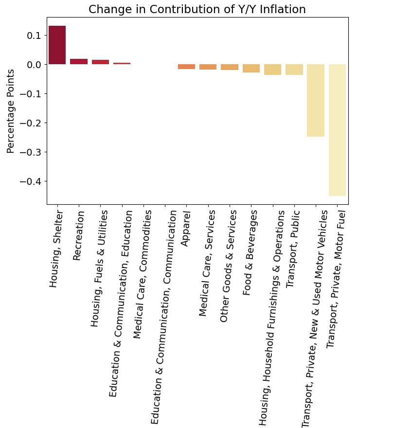 Inflacja "schronienia" odgrywa największą pozytywną rolę, stąd początkowy spadek indeksu. Skoro rynek nieruchomości dodaje wciąż do inflacji, Fed nie może wycofać się mocniej z podnoszenia stóp. Oczywiście cieszy spadkowy cen paliw oraz samochodów. Źródło: Macrobond, XTB