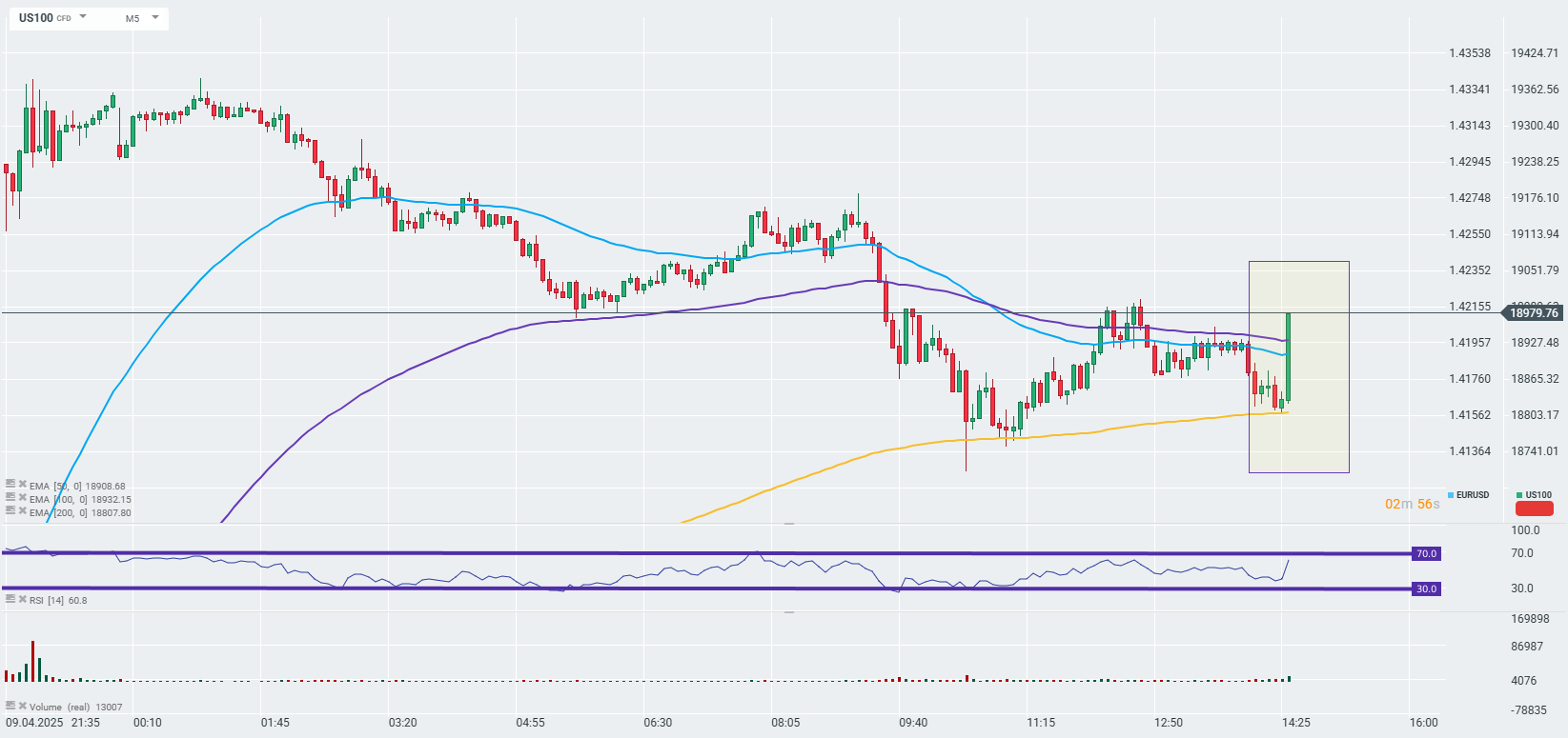 US100 zyskuje po raporcie CPI z USA. Niższe dane CPI powodują, że znacząco maleje szansa na utrzymywanie przez FED jastrzębiej polityki monetarnej w USA. Wraz z połączeniem wczorajszej decyzji Trumpa o wstrzymaniu podwyżek ceł są to potencjalnie dobre dane dla Wall Street.