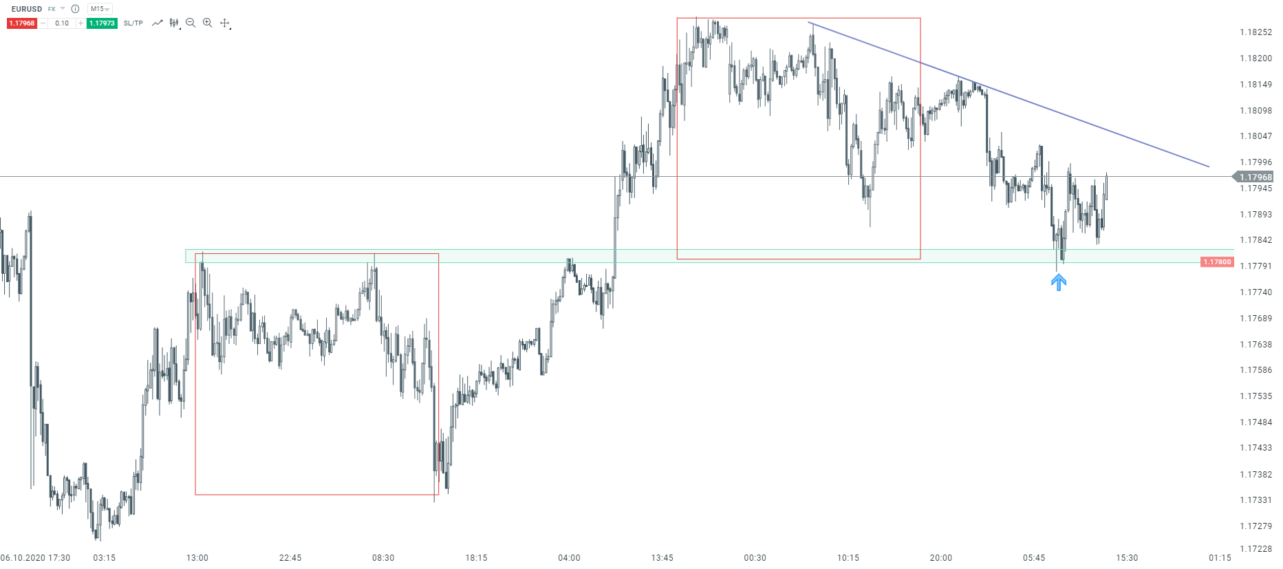 Patrząc na wykres EURUSD możemy obserwować nieznaczne wzrosty tuż po publikacji. Jeśli chodzi o interwal M15, notowania odbily się dziś od ważnego wsparcia przy 1,1780. Tak długo jak rynek utrzymuje się powyżej, istnieje szansa na dalszą zwyżkę. W momencie przekroczenia linii poprowadzonej po ostatnich szczytach, ruch w górę powinien przyspieszyć.