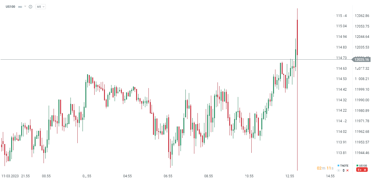 W pierwszej reakcji obserwowaliśmy spadki, ale następnie US100 powrócił na wyższe poziomy. Źródło: xStation5
