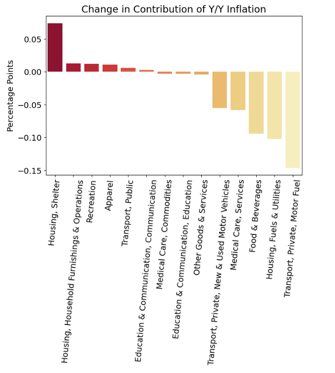 Rynek nieruchomości (ekwiwalent renty) kolejny raz z pozytywną zmianą w kontrybucji, ale spadek ze strony paliw i cen energii w mieszkalnictwie. Zaskoczeniem możemy być spadek w kontrybucji usług medycznych, które do tej pory miały się dobrze. Źródło: Macobond, XTB