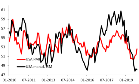 Pomiędzy wskaźnikiem PMI, a ISM widać dużą rozbieżnośc. Podczas gdy na PMI widać odbicie, ISM utrzymuje się przy ostatnich minimach.