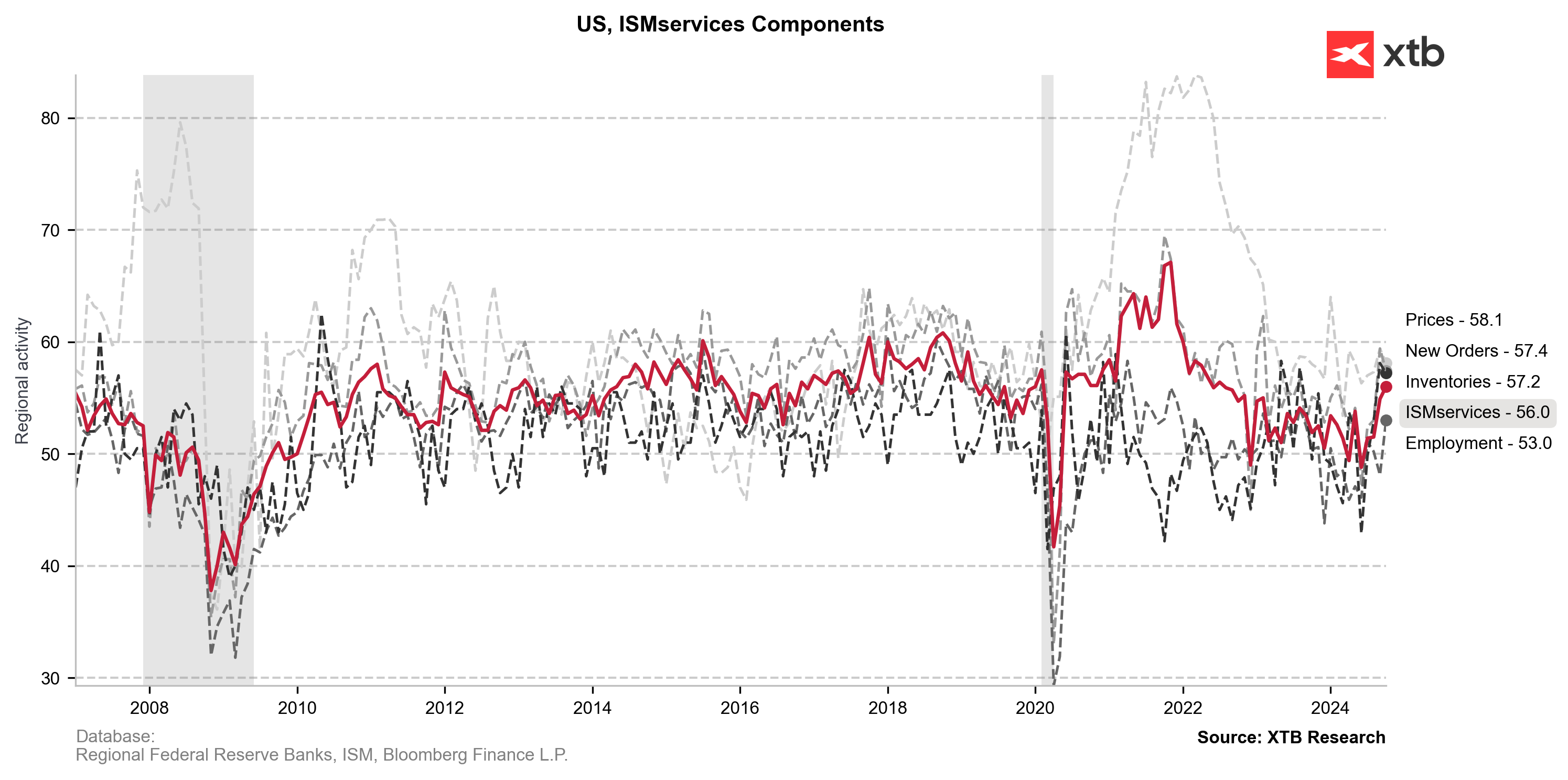 Wskaźnik ISM dla sektora usług w Stanach Zjednoczonych rośnie 4 miesiąc z rzędu, osiągając tym samym najwyższy od lipca 2022 poziom. Wydźwięk raportu jest z kolei mieszanym zachowaniem poszczególnych składowych indeksu ISM oraz nieco słabszym odczytem dla wskaźnika S&P Global. Porpawa jest widoczna przede wszystkim w przypadku zatrudnienia, które w obliczu ostatnich, ambiwalentych danych NFP i APD jest kluczową zmienną obserwowaną przez inwestorów przed czwartkową decyzją Fed. Słabiej wypadły natomiast zamówienia i aktywność gospodarcza, niemniej pozostały one w terytorium ekspansji (powyżej 50).