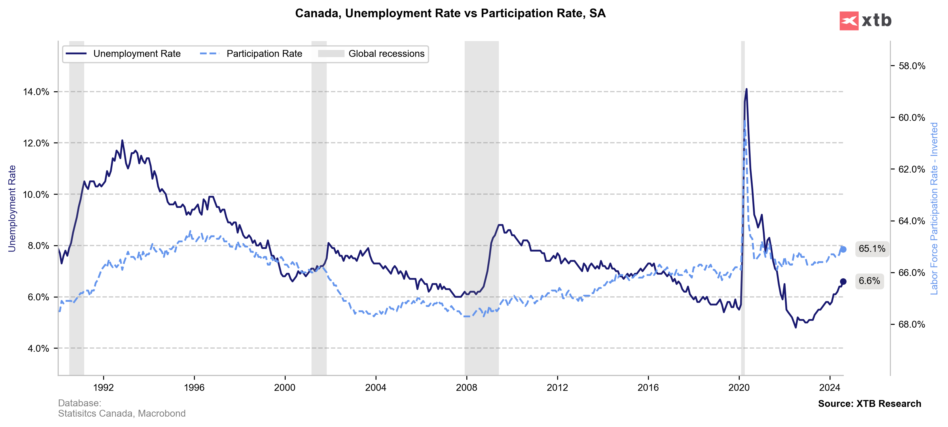 USDCAD traci ok. 0.2% w reakcji na słabsze dane z Kanady oraz mieszane dane z USA. Źródło: xStation5