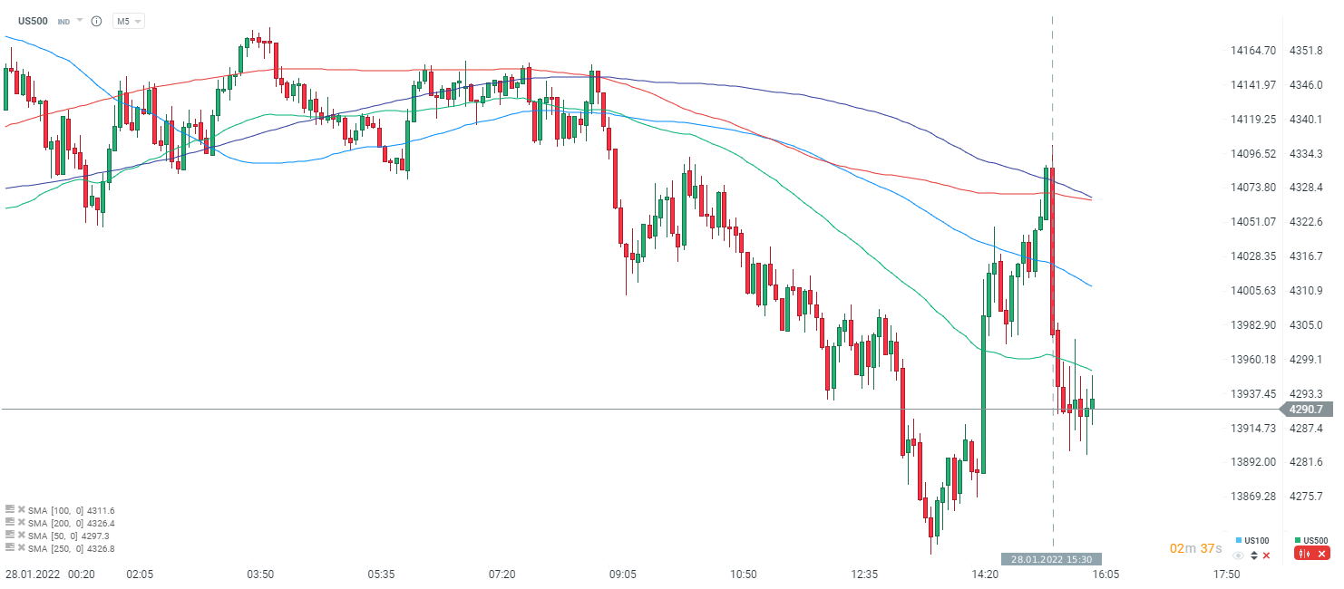 Niższe nastroje konsumentów, w szczególności wywołane wyższymi oczekiwaniami inflacyjnymi to teoretycznie negatywny scenariusz dla akcji. Nie ma jednak dużej zmienności po publikacji. Wcześniej kontrakty na S&P 500 próbowały odbijać w odpowiedzi na mieszane dane dotyczące kosztów pracy - były one niższe niż oczekiwano. Z drugiej jednak strony start sesji na Wall Street jest negatywny dla indeksu. Źródło: xStation5