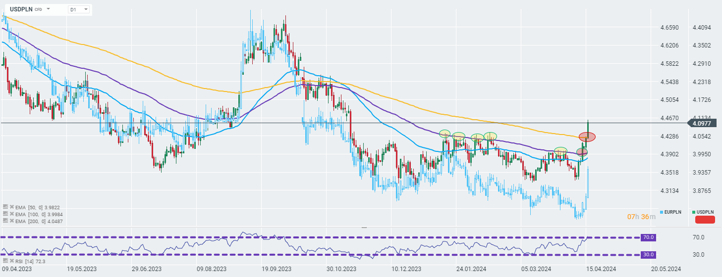 Para USDPLN odnotowuje 6 dzień z rzędu dynamicznych wzrostów, które doprowadziły ją na poziomy niespotykane od listopada 2024 roku oraz psychologiczną barierę 4.1000. Co więcej, jeszcze większą skalę wyprzedaży PLN widzimy na EURPLN, która dodaje 1,35% i odnotowuje tym samym największy wzrost intraday od czasu nieoczekiwanej decyzji o obniżce stóp procentowych RPP we wrześniu 2023 roku.