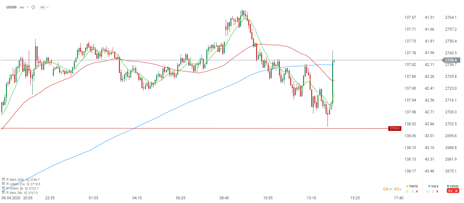 W USA kolejny bardzo silny przyrost wniosków o zasiłek dla bezrobotnych. Wstępne wnioski o zasiłek dla bezrobotnych wynoszą 6,6 mln, przy oczekiwaniu 5,25 mln oraz przy poprzednim poziomie 6,87 mln (zrewidowany do góry). Kolejne słabe dane, ale bez negatywnego wpływu na rynek. Kontrakty na S&P 500 odbijają po publikacji. Pozytywna reakcja na SP500 to możliwa odpowiedź na informacje płynące z Fed, który ma zapewnić kredyty na poziomie 2,3 bilionów dolarów.
