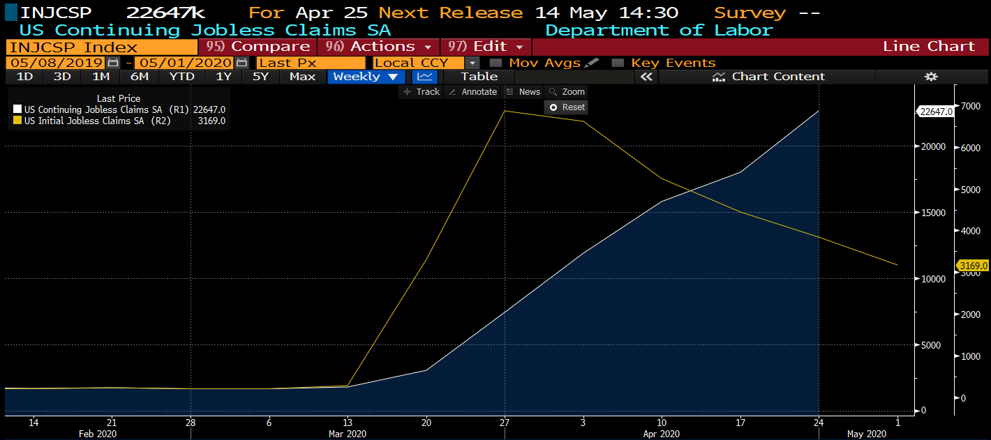 Odczyt bliski konsensusowi, ale w tym wypadku zdecydowanie ważniejszym odczytem jest odczyt kontynuacyjnych wniosków. Figura ta oznacza osoby, które pobierały kiedyś zasiłki i zgłaszają się ponownie. Widać, że mamy mocny przyrost względem poprzedniego tygodnia i co ważniejsze, większy od oczekiwań. Wnioski kontynuacyjne wypadają na poziomie 22,647 mln, przy oczekiwaniu 19,8 mln oraz przy poprzednim odczycie 18,01 mln.