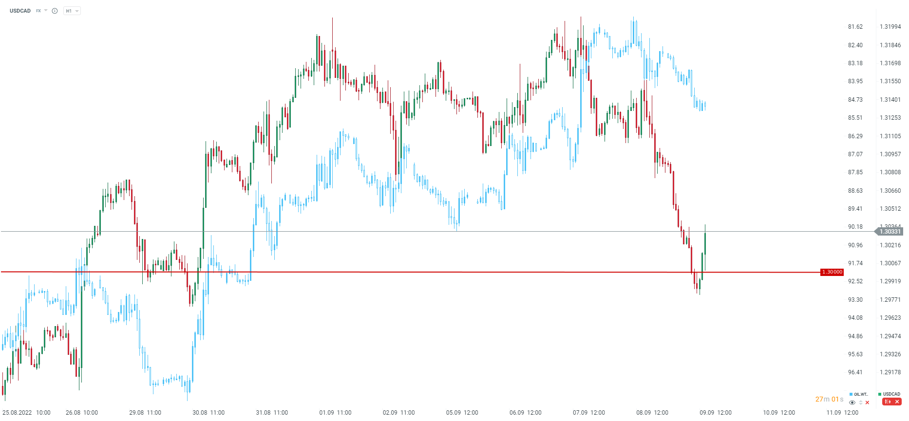 USDCAD redukuje wcześniejsze spadki, po osiągnięciu poziomu 1,30. Źródło: xStation5