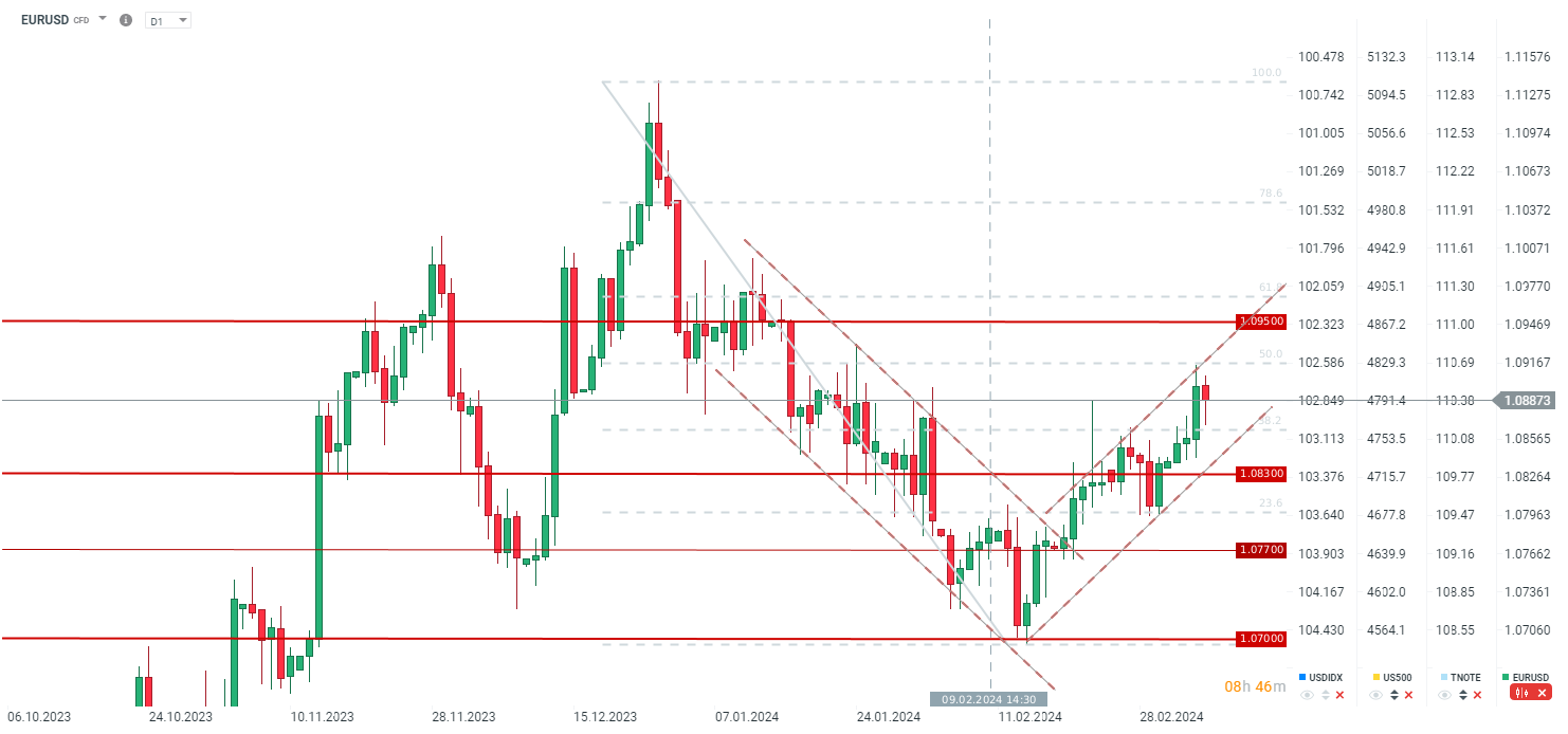 Na ten moment wydaje się, że kwiecień jest raczej mało prawdopodobny pod względem obniżki, ale nie można skreślać czerwca, choć na ten moment pierwszy termin obniżki może się przesuwać bardziej na pierwszy termin w drugiej połowie roku. Niemniej należy podkreślić, że Lagarde nie jest jastrzębia, choć jednocześnie wstrzymuje oczekiwania na rychłą obniżkę. EURUSD ogranicza spadki w ostatnich minutach