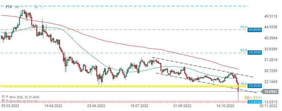 Wykres FTX, interwał D1. Token FTX zdołał zatrzymać spadki w okolicach poziomu 13,82 USD i obecnie testuje wcześniej przełamane dolne ograniczenie kanału spadkowego. Niemniej jednak dopiero zdecydowane wybicie powyżej oporu przy 20,65 USD wskazywałoby na zmianę niedźwiedziego sentymentu. Źródło: xStation5