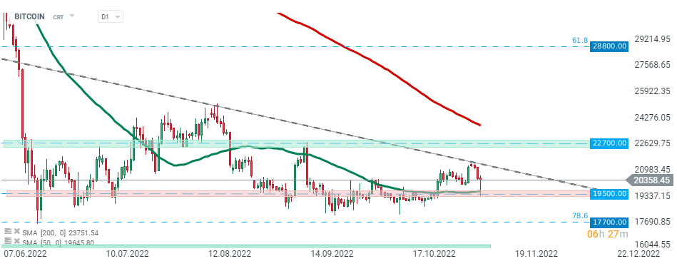 Bitcoin, interwał D1. Cena Bitcoina gwałtownie wycofała się w tym tygodniu, jednak sprzedający nie zdołali przebić się poniżej głównego wsparcia na poziomie $19500, a świeże optymistyczne wiadomości spowodowały euforyczne odbicie. Najpopularniejsza kryptowaluta zdołała wymazać większość dzisiejszych strat, niemniej jednak dopóki cena znajduje się poniżej długoterminowej linii trendu spadkowego, główny sentyment pozostaje niedźwiedzi i nadal może zostać uruchomiony kolejny impuls spadkowy w kierunku wsparcia przy 17 700 USD. Z drugiej strony, jeśli kupującym uda się wybić ponad wspomnianą linię trendu, ruch wzrostowy może przyspieszyć w kierunku oporu przy 22.700 USD, gdzie znajdują się maksima z września 2022 roku. Źródło: xStation5