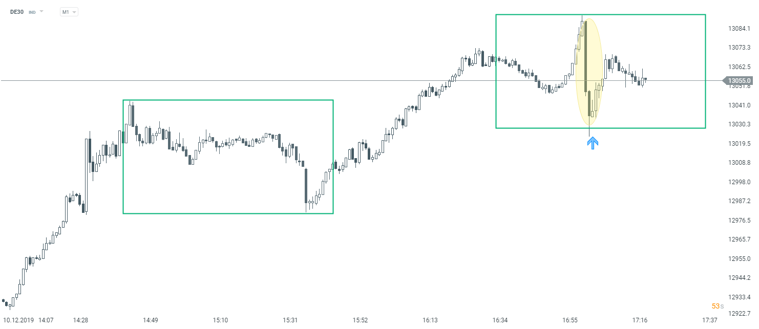 Przed chwilą doradca Białego Domu Lawrence Kudlow powiedział, że nie może potwierdzić informacji o przesunięciu terminu. Indeksy wyraźnie cofnęły, jednak reakcja była chwilowa. Patrząc na DE30, kurs dotarł do dolnego ograniczenia układu 1:1, gdzie od razu pojawiła się reakcja popytu.