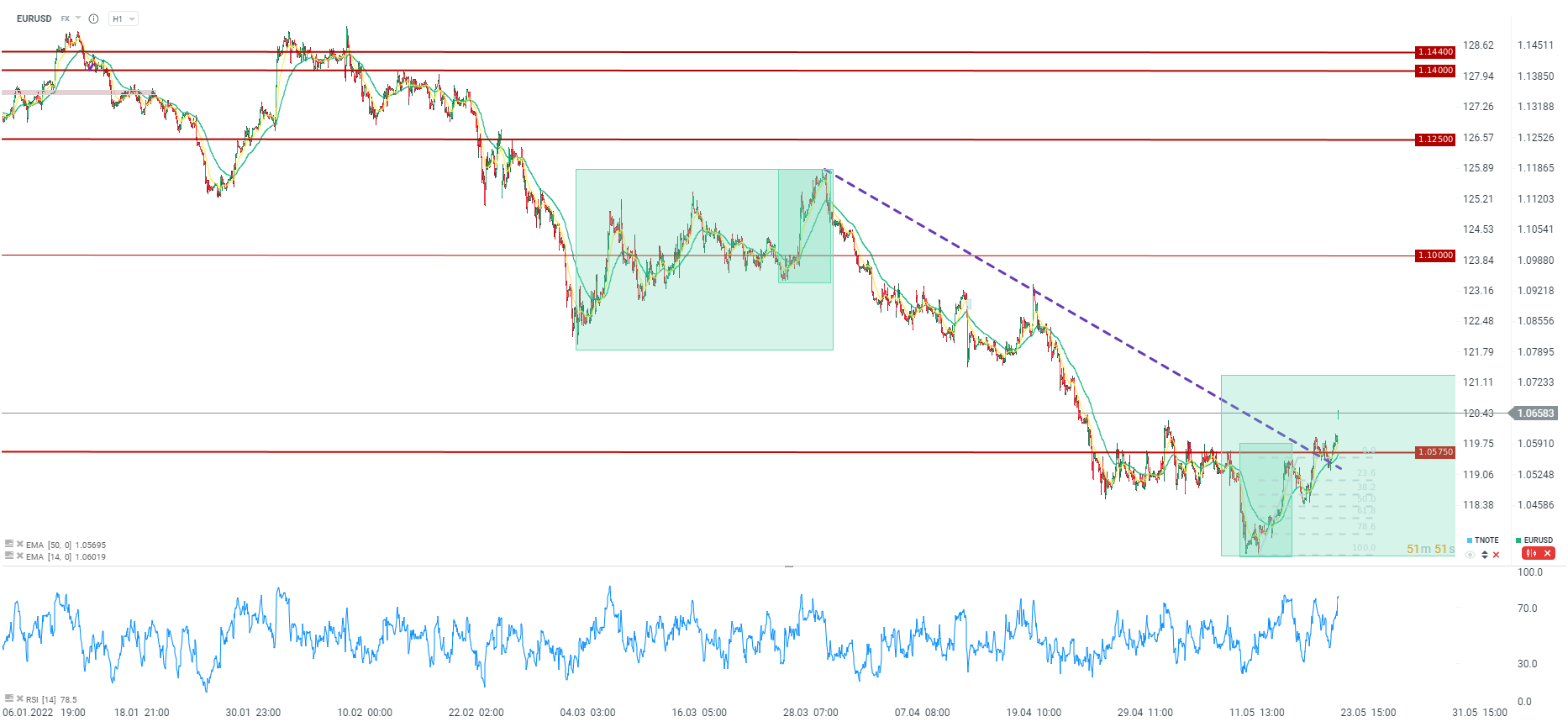 Konkretne jastrzębie słowa ze strony szefowej EBC. EURUSD może kierować się do zakresu większej korekty w trendzie spadkowym, czyli w okolicach 1,075.Źródło: xStation5