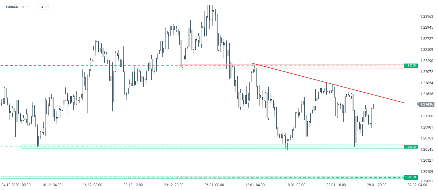 Patrząc na główną parę walutową, nie widać większej reakcji po danych. Kluczowym wsparciem w krótkim terminie dla EURUSD pozostaje strefa przy 1,2060, gdzie znajdują się lokalne minima, z kolei opór wypada przy 1,2220. Dopiero pokonanie jednego ze wspomnianych poziomów mogłoby doprowadzić do większego ruchu trendowego. Aktualnie warto też zwrócić uwagę na linię poprowadzoną po ostatnich wierzchołkach.