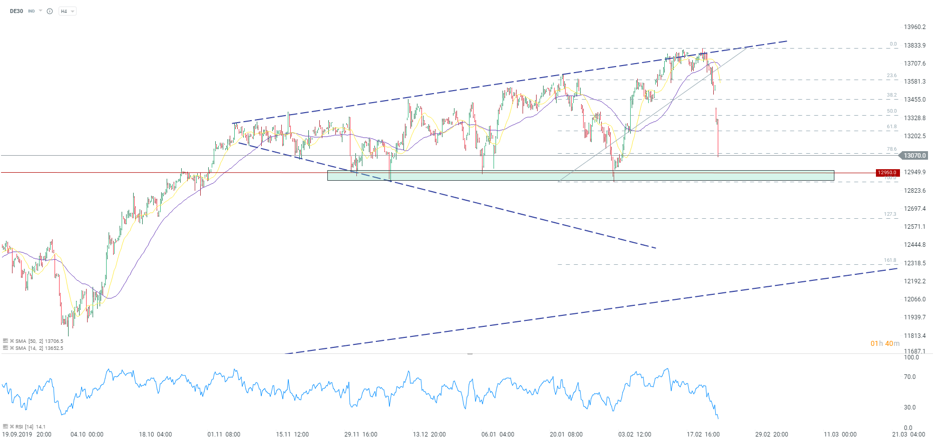 O godzinie 10:00 poznaliśmy najważniejsze dane z sesji europejskiej w postaci wskaźniku nastrojów biznesowych Ifo za luty. Indeks wzróśł z poziomu 96 punktów do 96,1 punktów, ale oczekiwano spadku do poziomu 95,3 punktów. Odnotowano lepsze dane dotyczące oczekiwań oraz oceny bieżącej sytuacji w porównaniu do konsensusów. Mimo wszystko dane te nie wpływają na DAXa, który kontynuuje silne cofnięcie. Obecnie DAX będzie przymierzał się do testowania okolic 13000 punktów.