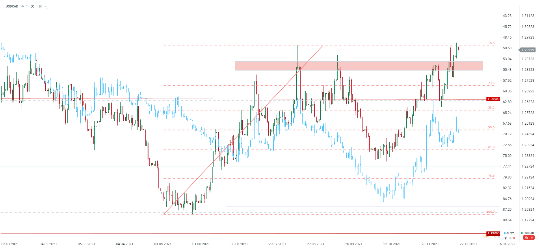 Niemniej warto zwrócić uwagę na sytuację na USDCAD. USDCAD odbija się od ważnego oporu wyznaczonego przez ostatni lokalny szczyt. Ropa wyraźnie odbiła wczoraj po informacjach, iż szczepionka Moderny po 3 dawkach ma dawać odporność na Omicrona, co zmniejsza szanse na zapaść gospodarczą na świecie, a zarazem drastyczny spadek popytu na ropę.