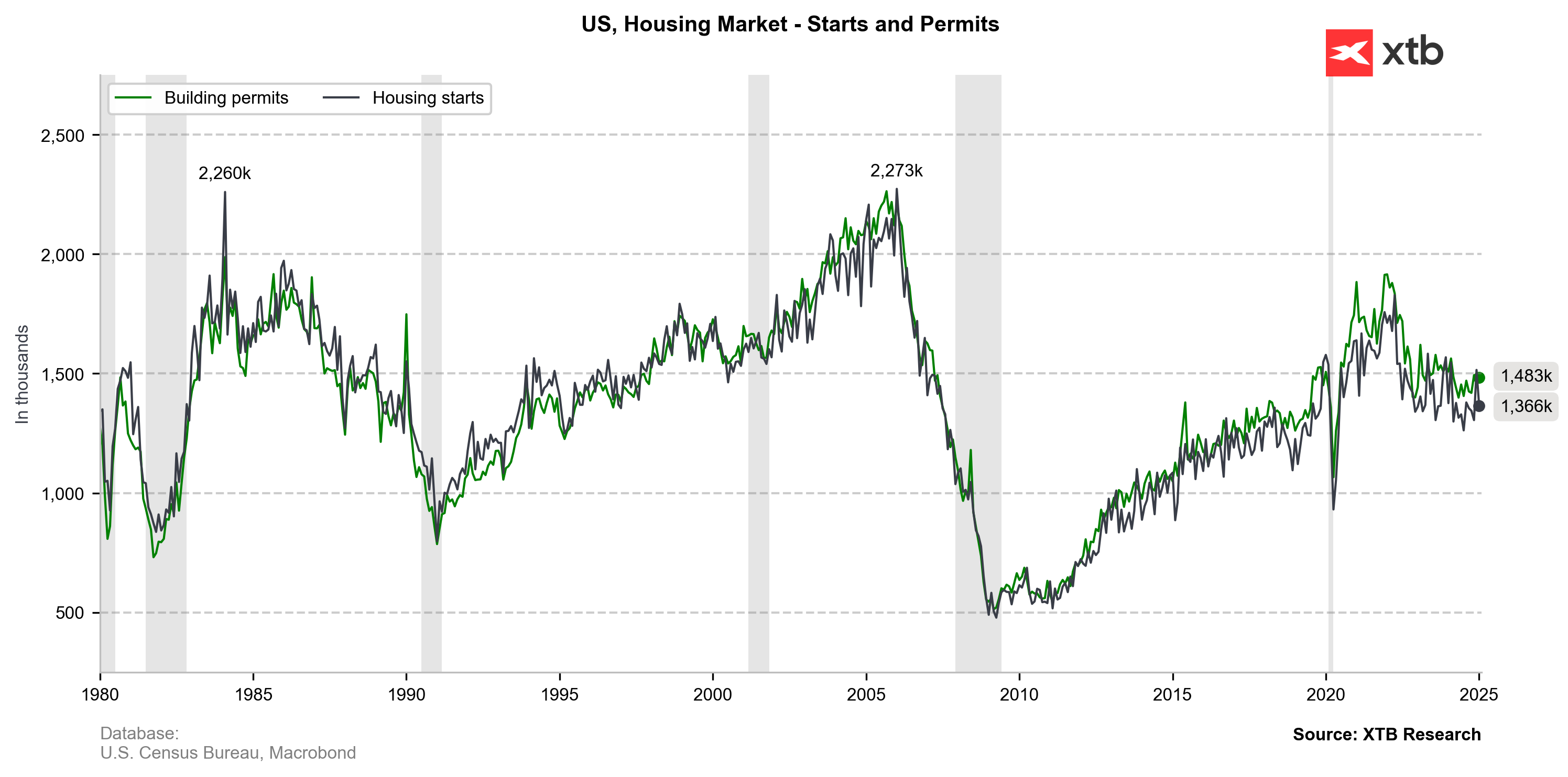 Dane z amerykańskiego rynku nieruchomości okazały się mieszane. Z jednej strony mamy do czynienia z wyższym od oczekiwań spowolnieniem nowo rozpoczętych budów domów (-9,8% m/m wobec oczekiwań: -7,3% m/m). Z drugje strony wydano więcej pozwoleń na budowę niż wcześniej przewidywano.