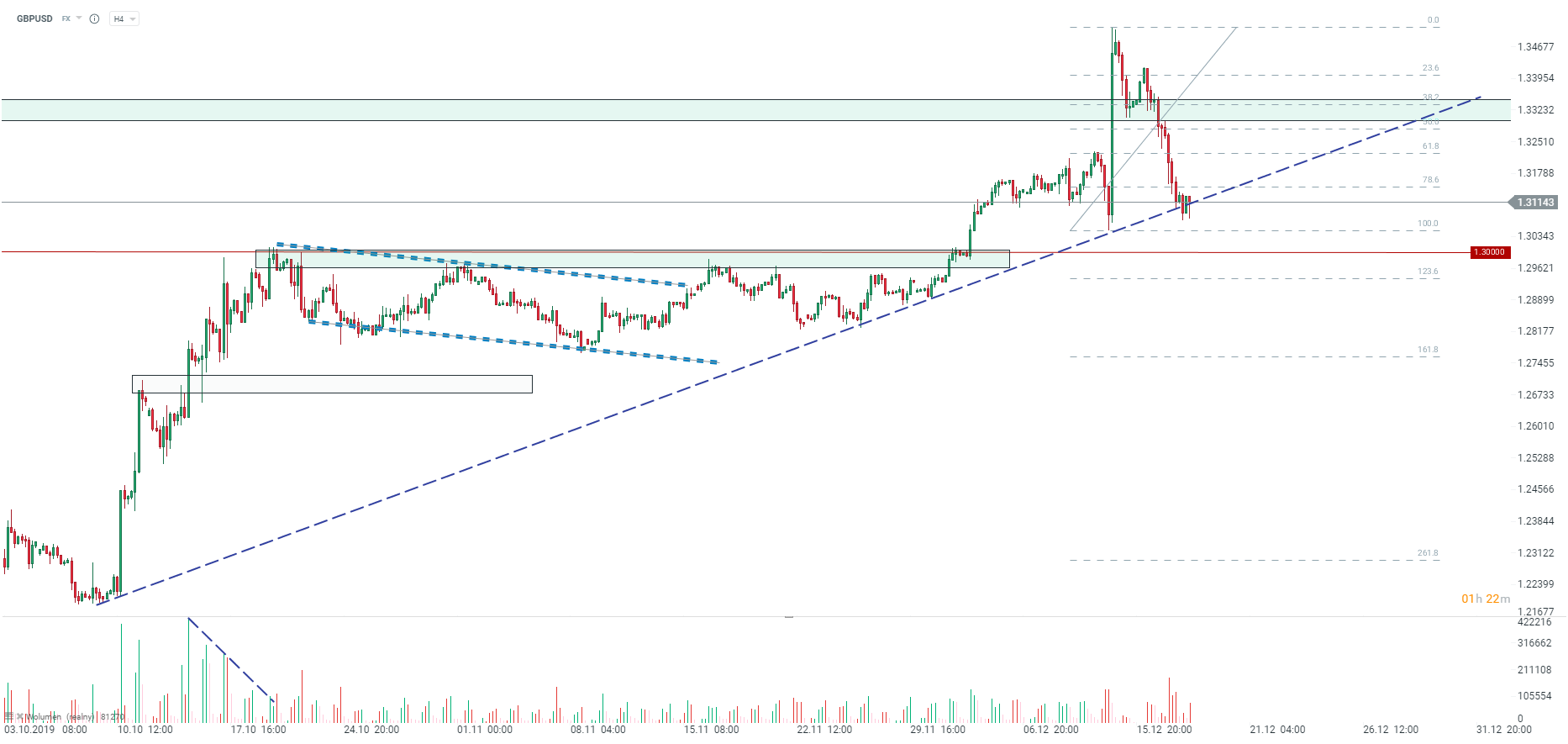 Mała zmienność na funcie po publikacji danych, które wypadają blisko zakładanych poziomów. Sytuacja techniczna na parze GBPUSD jest jednak bardzo interesująca. W tym momencie wygląda na to, że doszło do fałszywego wybicia trendu wzrostowego na parze. Źródło: xStation5
