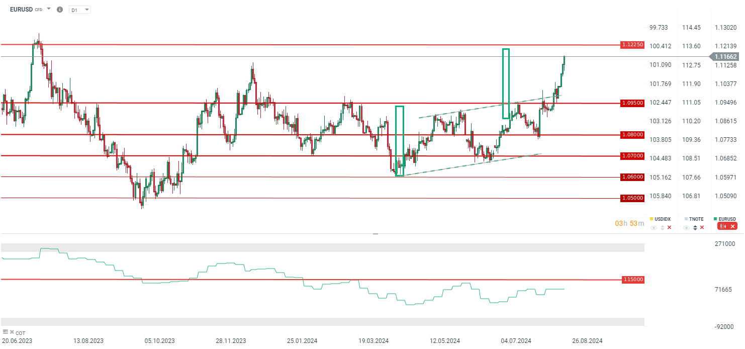Minutes FOMC jest zdecydowanie bardziej gołębie niż oświadczenie z lipca i potwierdza słowa Powella z konferencji. Fed jest gotowy na obniżki i musiałoby dojść do sporego zaskoczenia wysokim odczytem inflacyjnym, aby Fed zdecydowałby się nie obniżać we wrześniu. Jednocześnie jednak członkowie Fed nie chcą na ten moment decydować się na większe obniżki. Niemniej we wrześniu powinniśmy zauważyć rewizję dot-chartu, który wskaże na 2 lub 3 obniżki. Oczywiście 2 obniżki byłyby rozczarowaniem dla rynku. EURUSD rośnie na nowe dzienne szczyty i jest najwyżej od lipca zeszłego roku. US500 powraca do wzrostów i znajduje się w okolicach wczorajszego otwarcia.