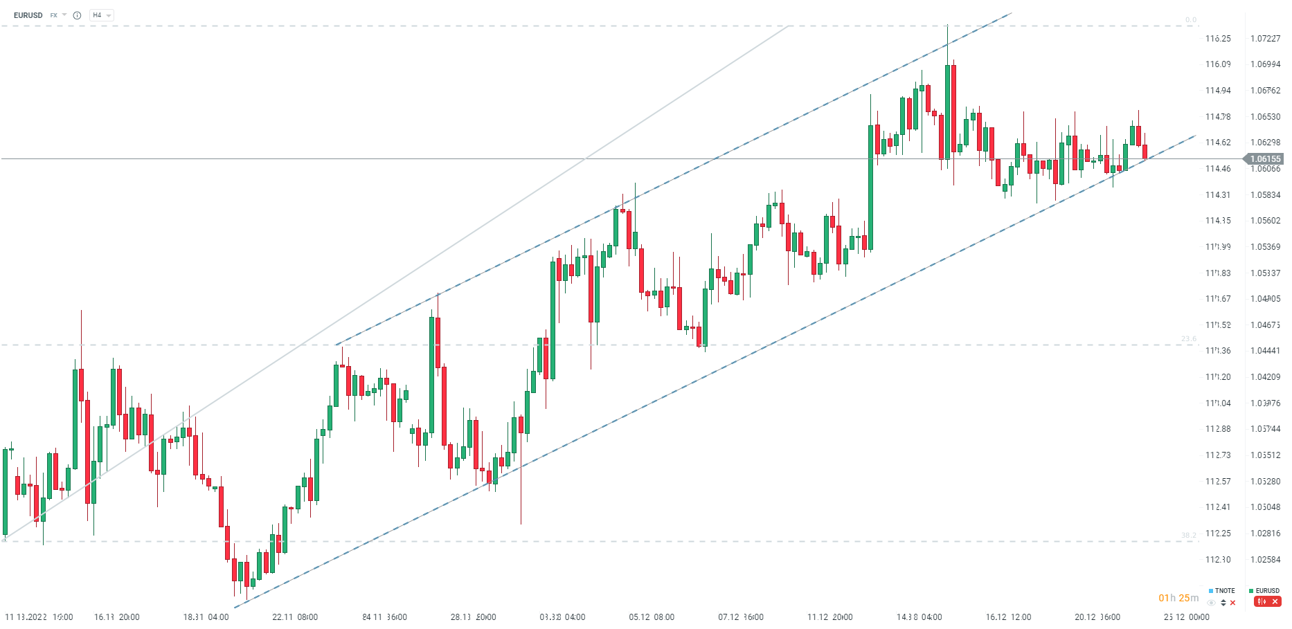 EURUSD reaguje negatywnie na dane (dolar się umacnia) i dochodzi do kolejnego testu dolnego ograniczenia wzrostowego kanału. Jutro kluczowy odczyt inflacji PCE, która zdeterminuje nam to, czy para pozostanie powyżej 1,06 przed świętami. Źródło: xStation5