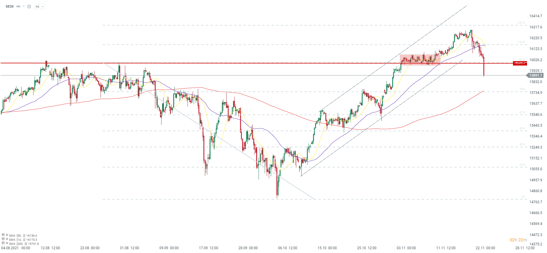 Dobre dane umacniają euro, ale nie poprawiają nastrojów na europejskich indeksach. DAX dalej tonie, co jest efektem wczorajszego wyboru szefa Fed, który może się skłaniać do szybszych podwyżek. Dodatkowo Schnabel z EBC wskazała, że jest możliwe, iż skupy w ramach PEPP zakończą się w marcu przyszłego roku, czym mogła popsuć nastroje wśród europejskich inwestorów.