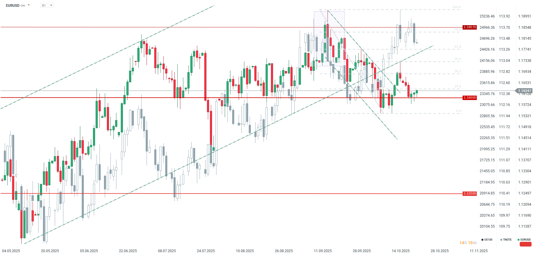 Patrząc na parę EURUSD obserujwmy wyraźną próbę wzrostów w trzech ostatnich sesjach, z popytem w okolicach poziomu 1,1600. Dolar amerykański zachowuje się niepewnie przed decyzją Fed oraz niepewności związanej z dalszym zamknięciem prac rządu. Choć obserwujemy powrót rentowności w USA powyżej 4%, EURUSD w dalszym ciągu znajduje się w sporej dywergencji z TNOTE, która sugeruje nadmiernie mocnego amerykańskiego dolara.