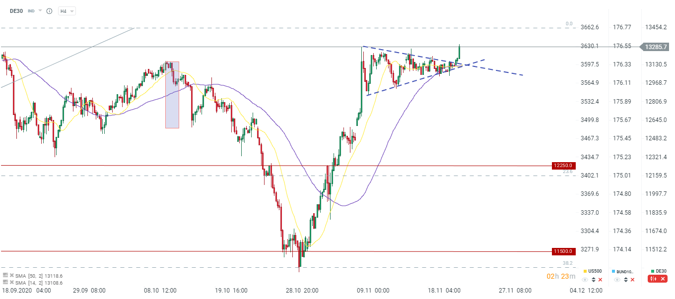 Podczas, gdy na euro nie dzieje się zupełnie nic po danych, to pozytywne zaskoczenie PMI dla przemysłu z Niemiec prowadzi do wyraźnego umocnienia na niemieckim DAXie. DAX wybija się dzisiaj z formacji trójkąta i znajduje się już najwyżej od wielu miesięcy. Źródło: xStation5