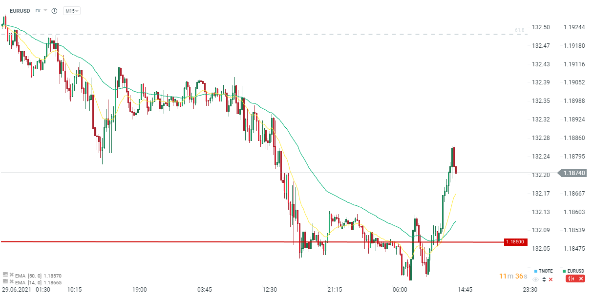Dolar próbuje kontynuować umocnienie, po ostatniej serii wyprzedaży. Poziom 1,1850 pozostaje kluczowym wsparciem. Źródło: xStation5