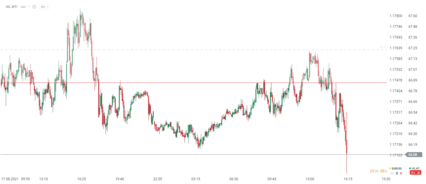 W odpowiedzi na raport, ropa spada na dzienne minima, ale zmienność jest duża, co pokazują dwie ostatnie świece. Raport powinien być raczej pozytywnie traktowany przez inwestorów, w szczególności, że ostatnie raporty DOE były bardzo słabe dla ropy. Źródło: xStation5