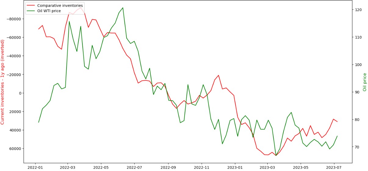 Spory wzrost zapasów, niespodziewany, ale jednocześnie niewiele zwiększa to zapasy komparatywne (poniższy wykres). Ropa kontynuuje wzrosty i WTI testuje niemal 76 USD za baryłkę.