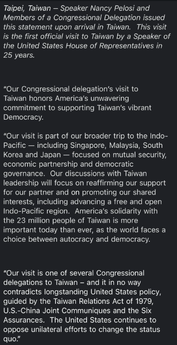 Całą sytuację zaczynają komentować przedstawiciele rządu Chin. Chiny zaraz po przylocie Pelosi zapowiedziały przeprowadzenie manewrów wojskowych blisko Tajwanu między 4-7 sierpnia. Co więcej, chiński establishment zakomunikował, że podejmie wszelkie wymagane kroki, aby utrzymać integralność terytorialną wobec przylotu Pelosi.