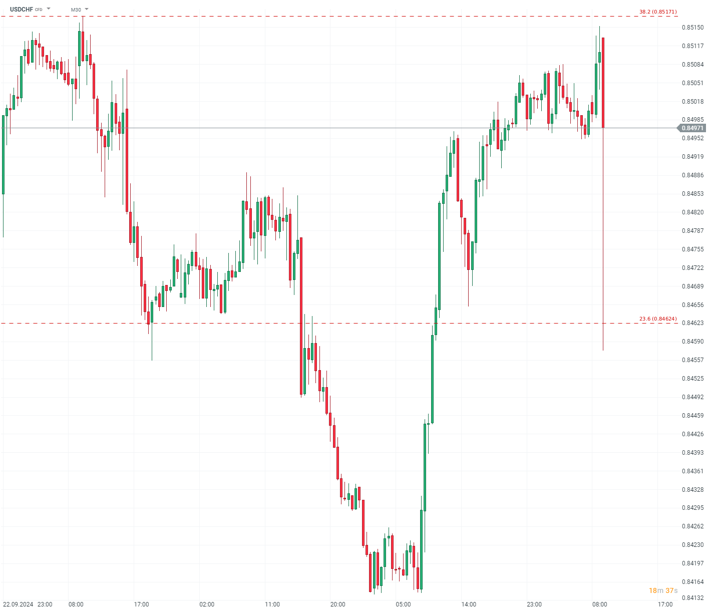Decyzja Narodowego Banku Szwajcarii o obniżeniu stóp procentowych (SNB policy rate) o 25 pb. została potwierdzona i była zgodna z konsensusem. USDCHF reaguje.