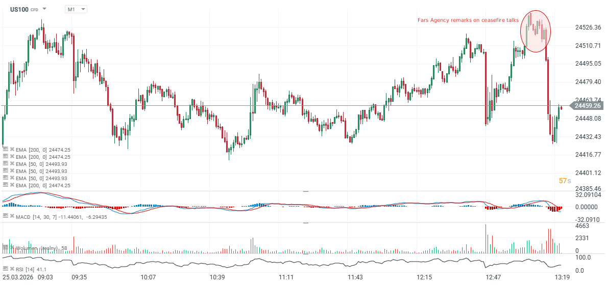 Według źródeł na które powołuje się irańska agencja prasowa Fars, Iran nie zaakceptuje zawieszenia broni ani nie rozpocznie tego procesu ze stroną, która naruszyła jego porozumienia. W pierwszej reakcji na komentarz kontrakty na Nasdaq 100 (US100) cofnęły się. Iran stwierdził, że w obecnych warunkach negocjacje nie są opłacalne, ale stwierdził też, że USA zintensyfikowały wysiłki na rzecz doprowadzenia do rozejmu.