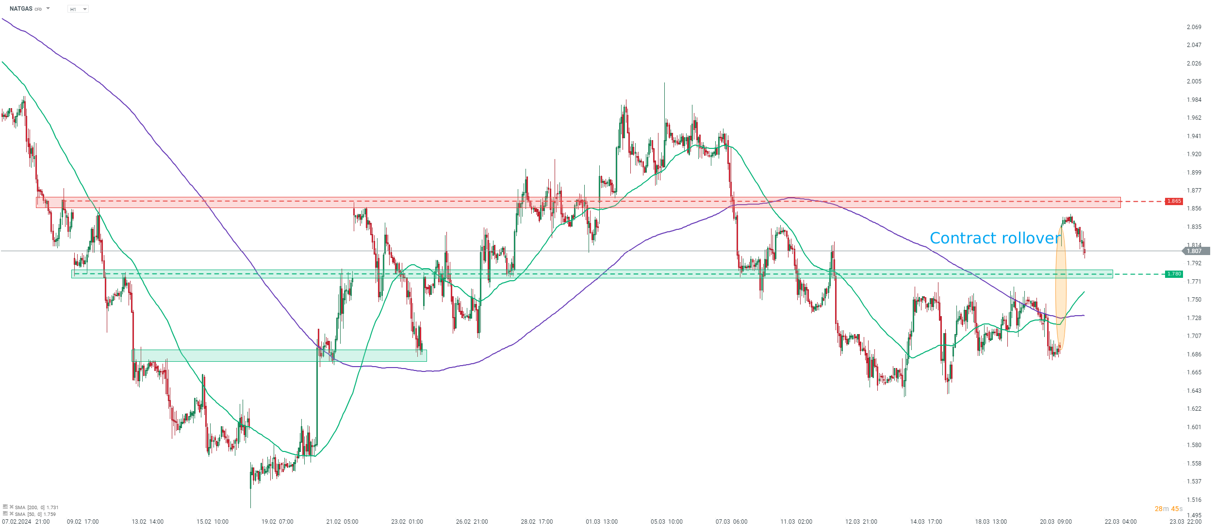 Raport amerykańskiej agencji EIA wskazał na wyższe, niż oczekiwano zapasy gazu ziemnego, które wyniosły 7 miliardów stóp sześciennych (bcf), w czasie gdy rynek oczekiwał wzrostu o 3 mld bcf. W efekcie kontrakty NATGAS cofnęły się w okolice 1,8 USD za MMBTu. Poprzednio raport wskazał na spadek zapasów o 9 mld bcf. Raport w pierwszym dniu wiosny pokazał wyższy, niż oczekiwano wzrost zapasów, po sezonie zimowym; zarazem był to pierwszy wzrost od listopada 2023 roku.