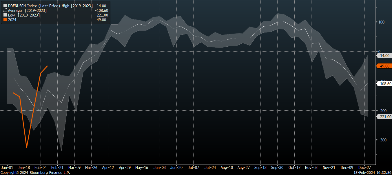 Zapasy spadają o 49 bcf. Oczekiwano spadku na poziomie 67 bcf. Poprzednio był to spadek o 75 bcf. Warto zauważyć, ze jest to najmniejszy spadek zapasów gazu dla danego okresu od 5 lat. Tak niski spadek zapasów jest zwykle widoczny w okolicach połowy marca.