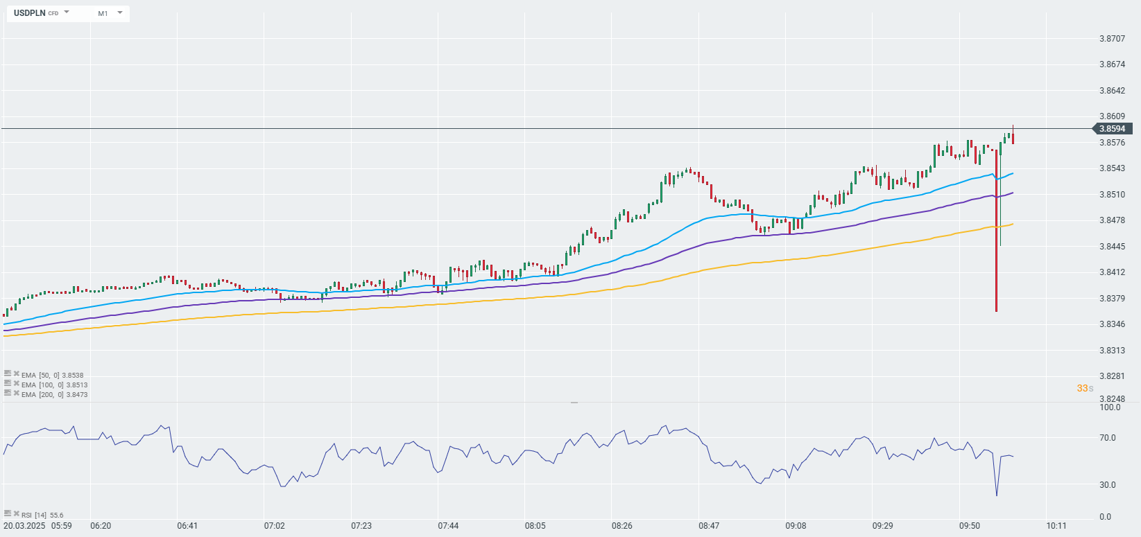 Polski złoty traci na wartości w stosunku do USD po publikacji danych. Rosną szansę na szybsze obniżki stóp procentowych w Polsce, dlatego też obserwujemy kontynuację odbicia na parze z dolarem amerykańskim.