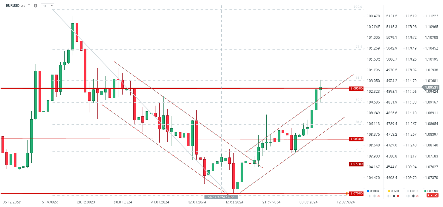 EURUSD wyraźnie rośnie w odpowiedzi na dane NFP. Dane dobre tylko powierzchownie, a szczegóły pokazują, że rynek pracy zaczyna się powoli chwiać. Zamknięcie powyżej 61.8 otwirzy drogę do poziomu 1,12, nawet w trakcie marcowego posiedzenia Fed, jeśli Powell zmieni swoje nastawienie na bardziej łągodne. Źródło: xStation5