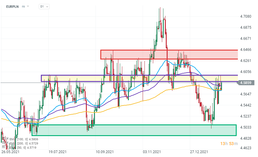 Para EURPLN, interwał D1. Notowania utrzymały wsparcie na poziomie wyznaczonym przez EMA 50 (niebieska linia) oraz EMA 200 (złota linia) i następuje kolejna próba wybicia powyżej poziomu 4,6. Źródło: xStation 5