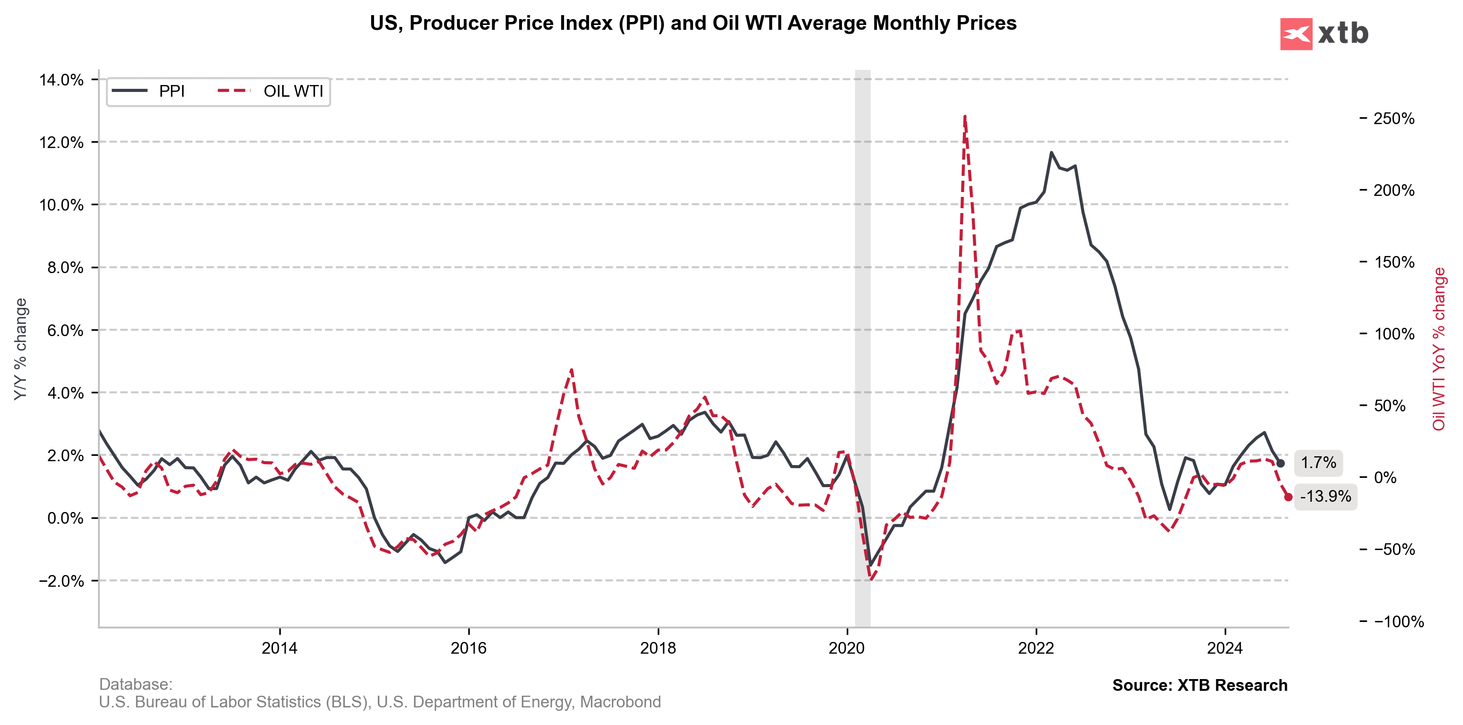 Ogromny udział w spadku głównej inflacji PPI miały ceny energii, a przede wszystkim ropy naftowej. Dolar w pierwszej reakcji umocnił się, ale szybko oddał wzrosty. Miesięcznie inflacja wypadła nieco powyżej oczekiwań, ale nie są to alarmujące dane. Niemniej jak pokazuje spadek inflacji CPI oraz minimalnie wyższe zaskoczenie ze strony PPI, może to pokazywać problemy z przerzuceniem kosztów producentów na konsumentów.