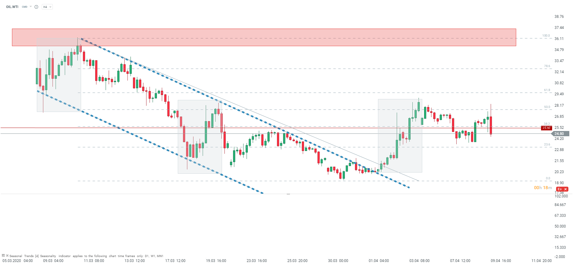 Oczywiście nowe liczby spływają praktycznie co minutę. Na ten moment jakakolwiek decyzja dzisiejszwego dnia wydaje się mało prawdopodobna i wiele będzie zależało od zaangażowania państw spoza OPEC+. Co więcej nie ma również konsensusu, co do punktu odniesienia. Na początku Arabia Saudyjska wskazywała, że miałaby ciąć z 12,3 mln brk do 8,75 mln brk, co dawałoby realnego cięcia w porównaniu do poziomów z lutego na poziomie zaledwie kilkuset tysięcy brk na dzień. Teraz mówi się o poziomie referencyjnym na poziomie 11,3 mln brk na dzień zarówno dla AS jak i dla Rosji. Co więcej, państwa OPEC poza AS wskazują, że miało dojść do porozumienia wcześniej pomiędzy AS i Rosją i teraz oba państwa perswadują głębokie cięcia na innych producentach. Co więcej, cięcia według ostatnich doniesień miałyby rozpocząć się dopiero od maja i być pogłębiane w czerwcu. Jak widać mamy do czynienia ze zdecydowanie większą ilością spekulacji niż konkretnych działań. Ostatnie doniesienia mówią o braku jakiegokolwiek konsensusu. Ropa cofa się poniżej 25 USD za baryłkę.