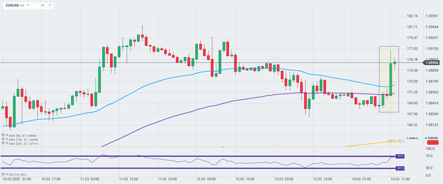 Niemieckie CDU i SPD uzgodniły rozwiązanie z Zielonymi w sprawie pakietu finansowego - podał korespondent Handelsblatt. Na ten moment nie wiadomo jednak czy chodzi o faktyczne porozumienie czy chęć kontynuowania uzgodnienia wspólnego stanowiska. Na ten moment jednak Rheinmetall (RHM.DE) przedłuża wzrosty, a EUR również zyskuje względem USD.