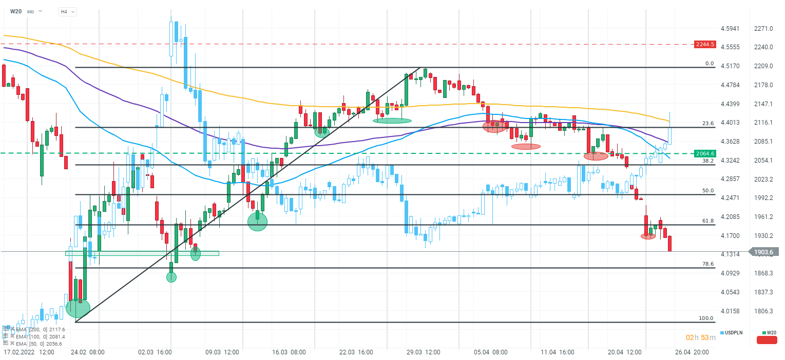 Dzisiejsza sesja na rynku polskim przynosi duże spadki wycen aktywów. Indeks W20 schodzi do poziomów niewidzianych od 8 marca i walczy o utrzymanie granicy 1900 punktów. Słabości doświadcza również złotówka, a para USD/PLN wystrzeliła do poziomu 4,4. Jak podał Onet, Rosja odcięła dostawy gazu do Polski w ramach kontraktu jamalskiego. Według niepotwierdzonych doniesień trwa właśnie spotkanie sztabu kryzysowego Ministerstwa Klimatu. Dla przypomnienia, w piątek upływa termin płatności za dostawy gazu w rublach. Ponure nastroje zdominowały dzisiejsze nastroje na rynkach światowych, kontynuując spadkową passę.