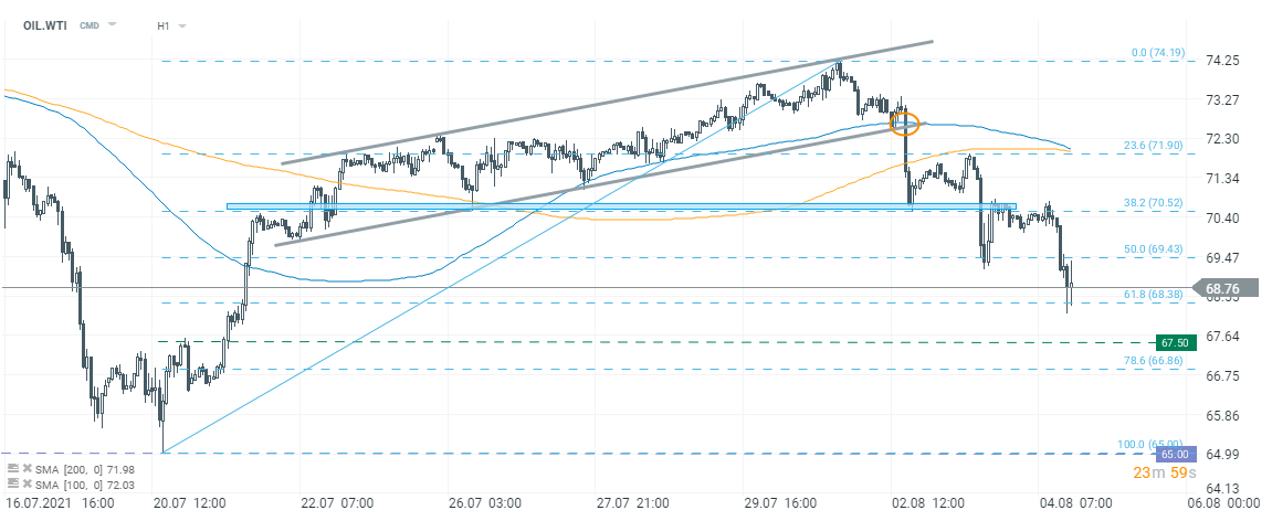 Przyrost zapasów ropy naftowej może stanowić niepokojący sygnał dotyczący popytu na surowiec - tym bardziej że zapasy wzrosły aż o 3,6 mln brk przy oczekiwanym spadku o 3,1 mln brk. Bezpośrednio po publikacji ceny WTI gwałtownie zanurkowały, obecnie rynek próbuje odrabiać te straty.