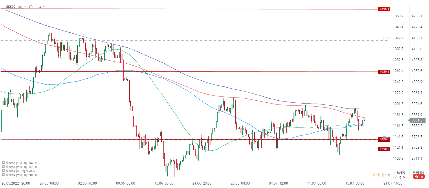 Kontrakty odbijają po wczorajszym cofnięciu na koniec sesji, ale napotkały kłopoty przy 100 SMA. Widać, że na H4 kluczowa strefa oporu znajduje się między 100 i 200 SMA. Źródło: xStation5