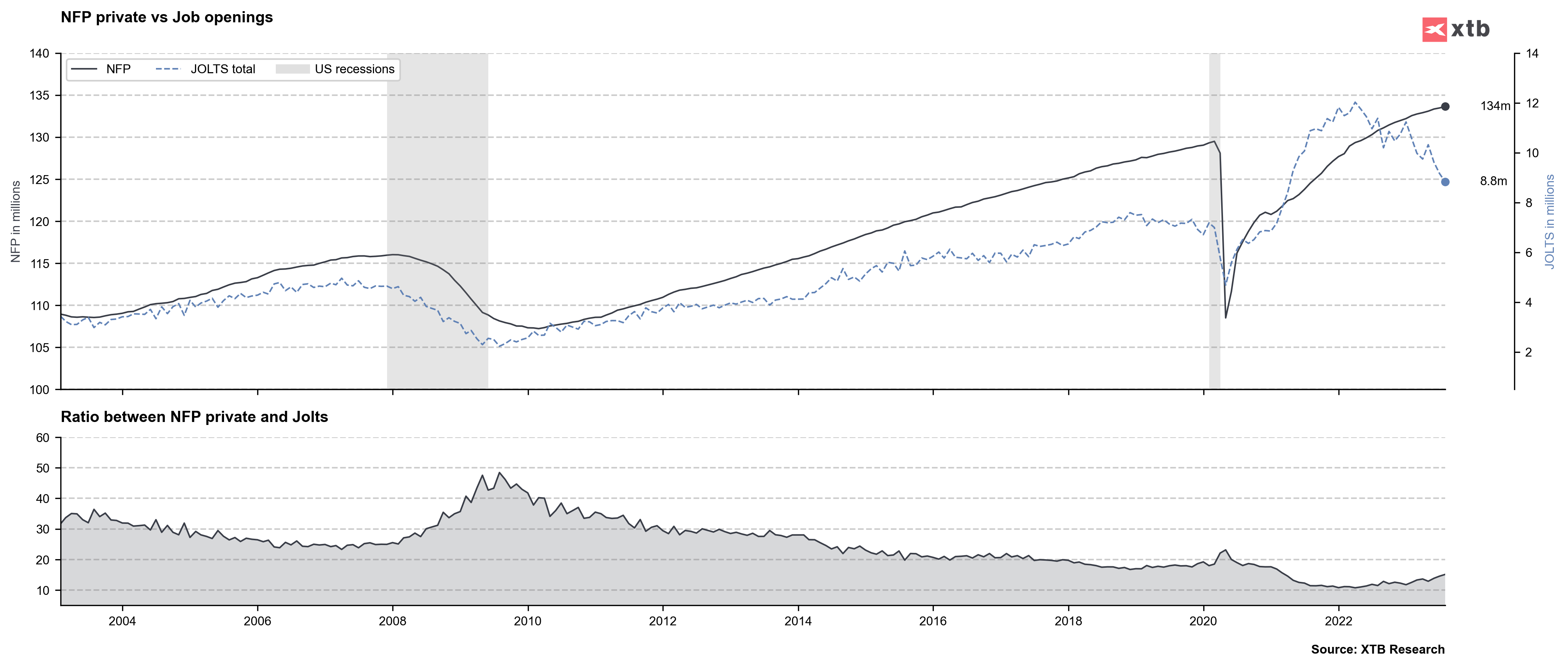 Stosunek NFP do JOLTS zaczyna rosnąć. Źródło: Macrobond, XTB