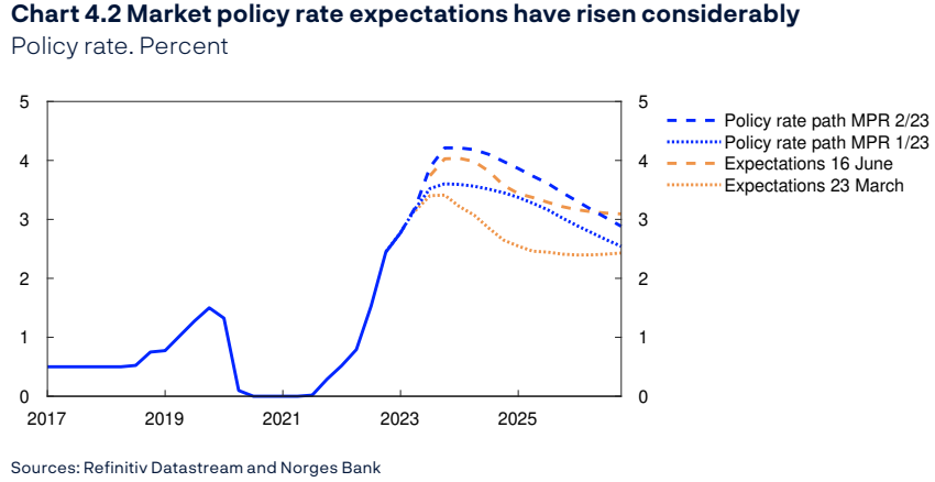 Co więcej, wydaje się, że to nie koniec cyklu podwyżek stóp. Na ten moment szczyt prognozowany jest jesnienią na poziomie 4,25% vs. 3,75% po dzisiejszym posiedzeniu.