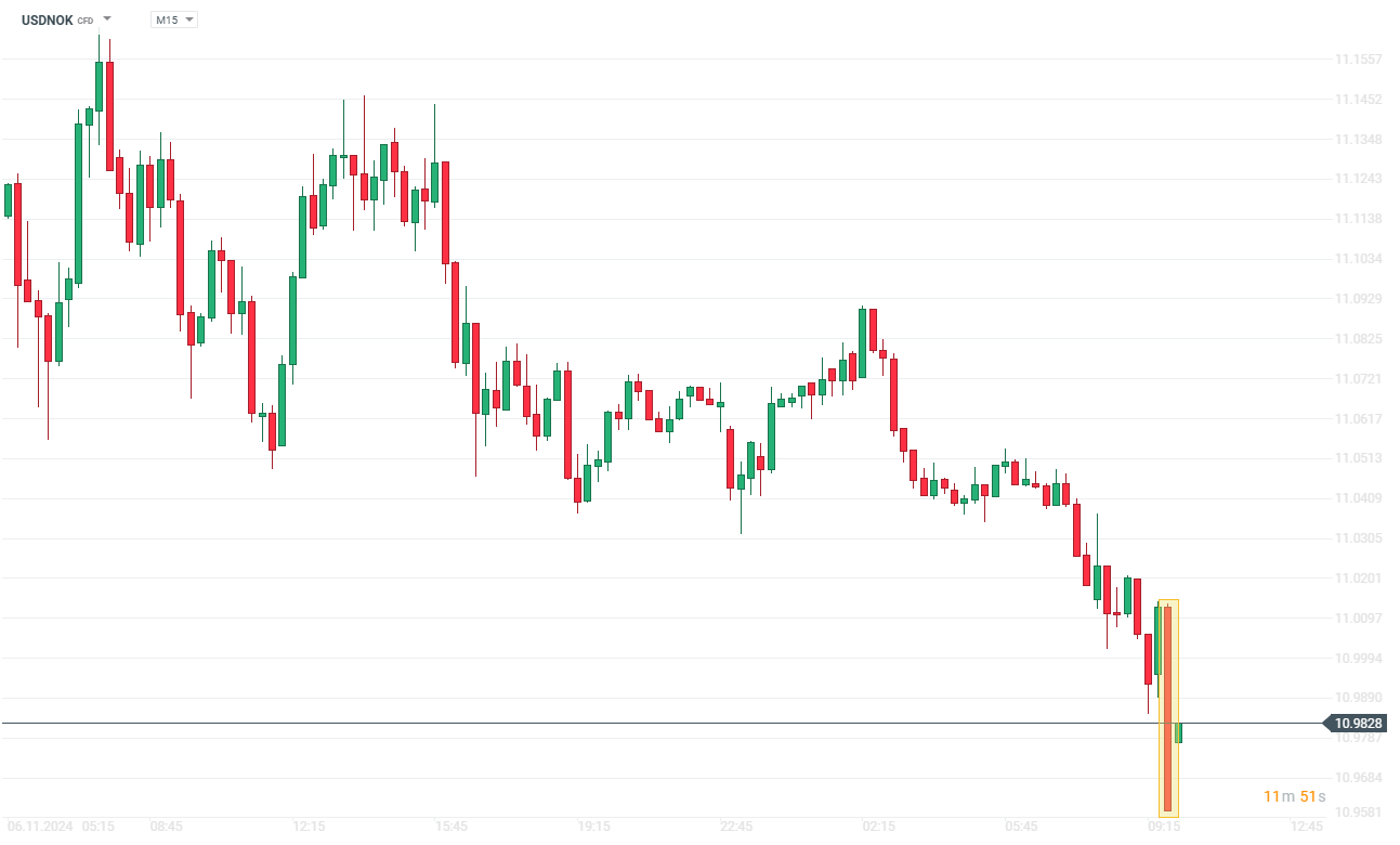 Po decyzji Norges Bank widzimy lekką deprecjację norweskiej korony, jednakże ruch ten wciąż pozostaje mniejszy niż umocnienie się waluty w stosunku do dolara po decyzji szwedzkiego banku w sprawie obniżki stóp procentowych o 50 pb.